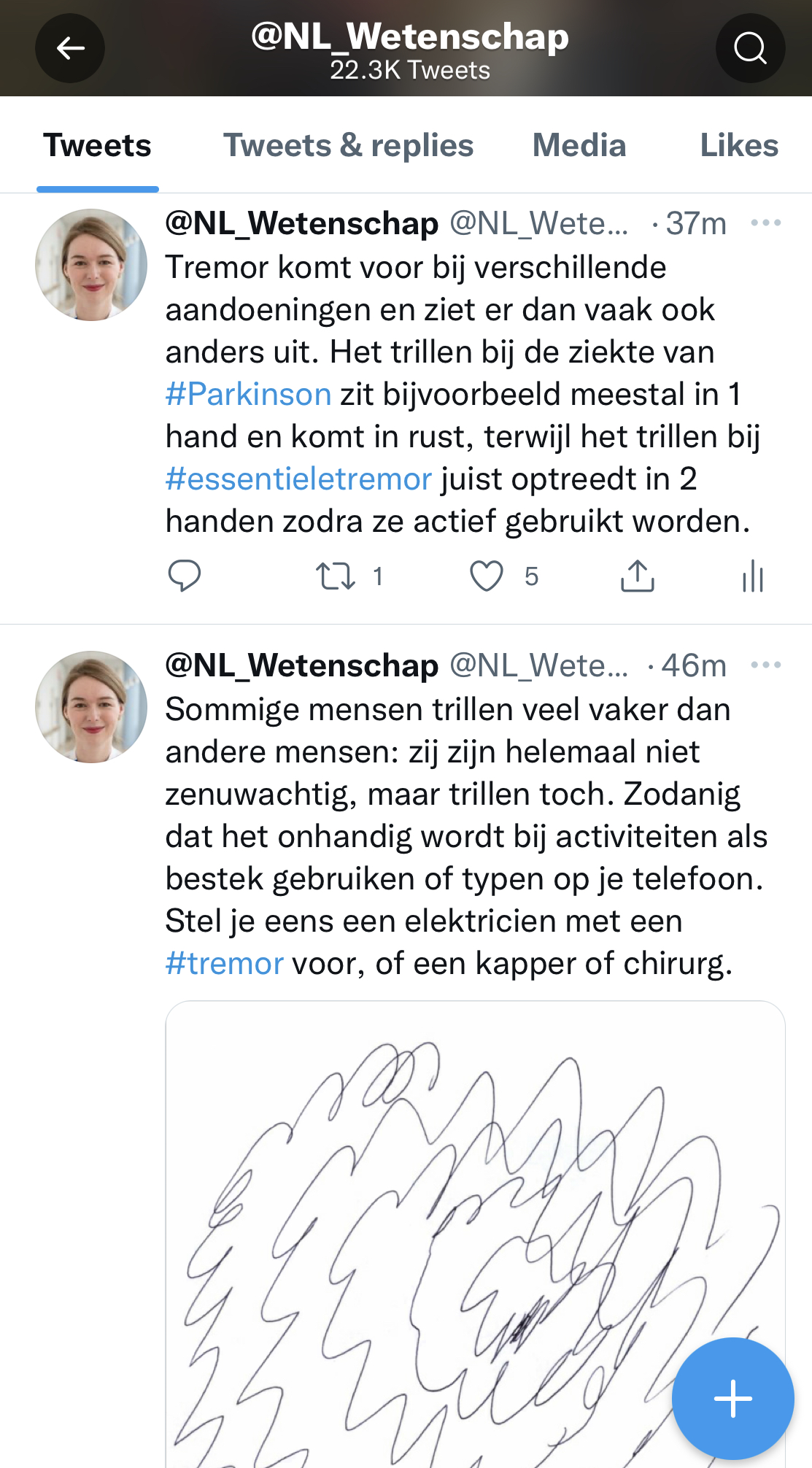 Deze week wordt op Twitter het account @NL_Wetenschap beheerd door Madelein van der Stouwe van Movement Disorders Groningen, UMCG. Vanaf dit Twitter-account worden elke week door een andere wetenschapper berichtjes gestuurd over hun onderzoek. Er worden veel mensen mee bereikt, er zijn namelijk 18.900 volgers.