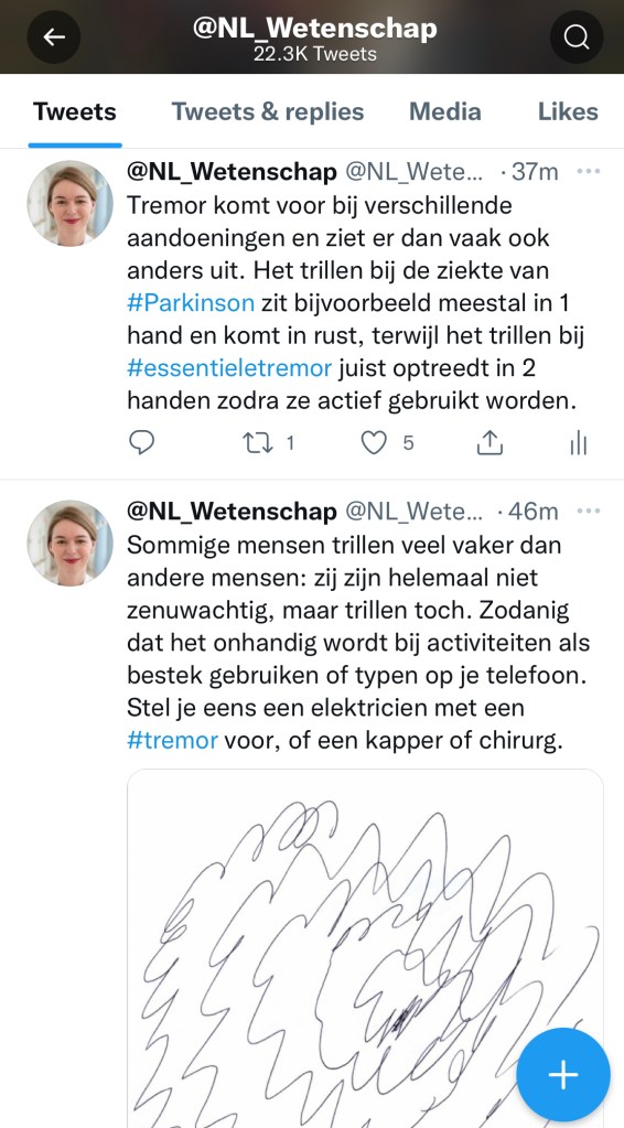 Deze week gaat het over bewegingsstoornissen en vandaag (woensdag) speciaal over tremor. Voor diegenen die actief zijn op Twitter misschien leuk om te volgen! We gaan het hebben over tremor in het dagelijks leven, het diagnosticeren van tremor, over onderzoek naar tremor, en over het (nog) niet bestaan van een patiëntenvereniging voor essentiële tremor.