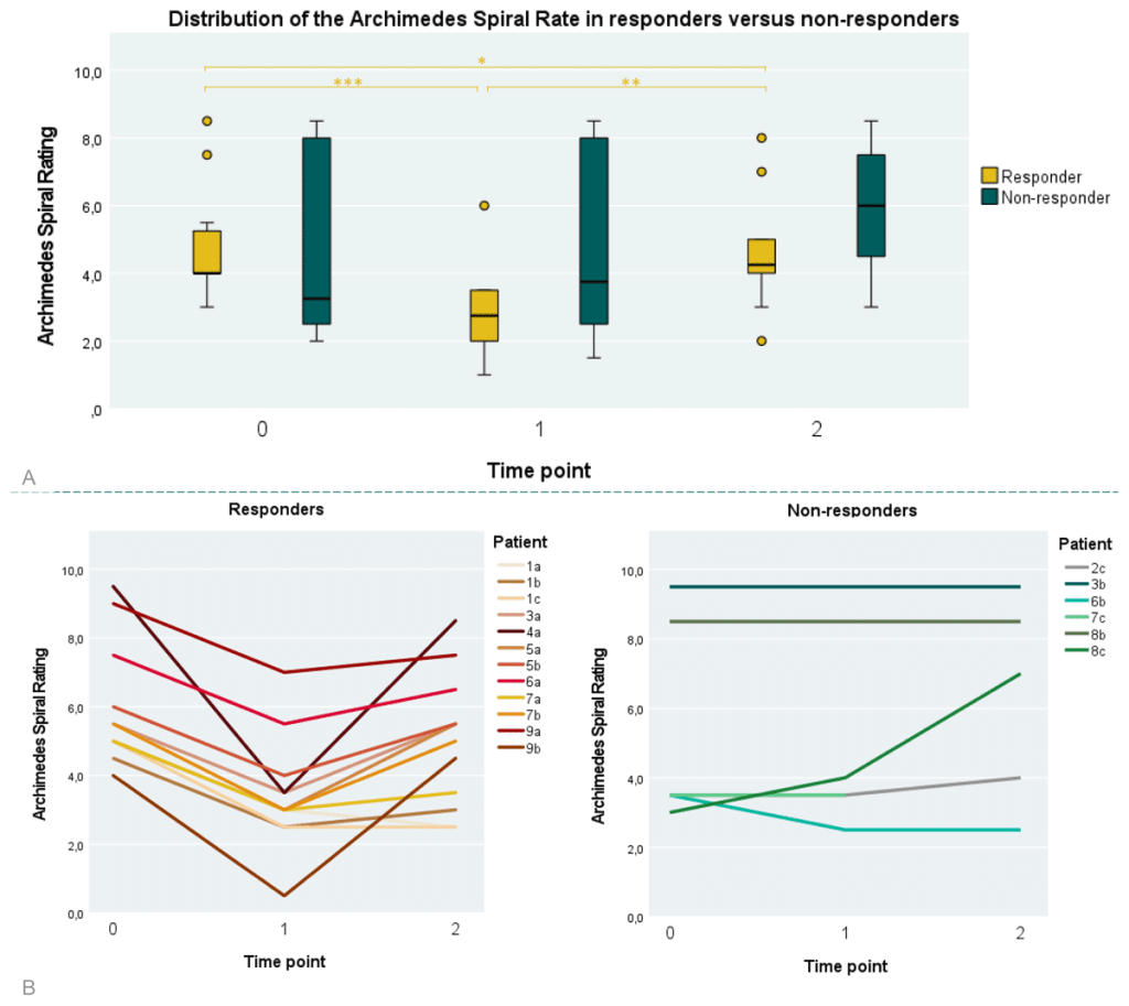 A) Verdeling van de Archimedes Spiraalscores (ASR) van respondenten en niet-respondenten op drie meetmomenten (N = 53 spiralen). Deze grafiek toont de tremorintensiteit van mensen die een verbetering van hun tremor ervaarden na alcohol (respondenten, geel) en mensen zonder verbetering (niet-respondenten, groen). Er is geen verschil in de beginscore tussen de twee groepen, maar bij respondenten daalde de tremorintensiteit aanzienlijk één uur na alcoholinname. Dit effect was de volgende ochtend verdwenen. De sterretjes (*) geven aan waar de verschillen tussen de metingen significant zijn. Time point 0: voor alcohol, time point 1: een uur na alcohol, time point 2: de ochtend erna. B) Individuele veranderingen in tijd van de ASR voor respondenten en niet-respondenten. Deze grafiek toont hoe de tremor bij elke persoon in de studie veranderde na alcohol. De cijfers staan voor families, de letters voor individuele deelnemers.