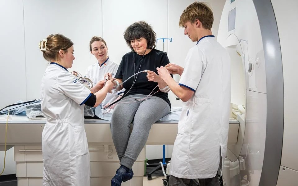 Sarah Jonker, Madelein van der Stouwe en Patrick Barkhuis bereiden patiënte Eveline Linbenbergh voor op de MRI-scan. Foto: Jaspar Moulijn, Dagblad van het Noorden.